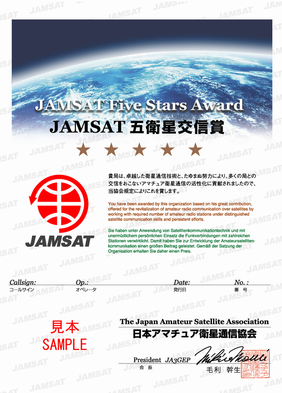 On behalf of the JAMSAT(Japan-AMSAT) board, it is my great honor to draw your attention to our brand new award, named JAMSAT Five Stars Award.