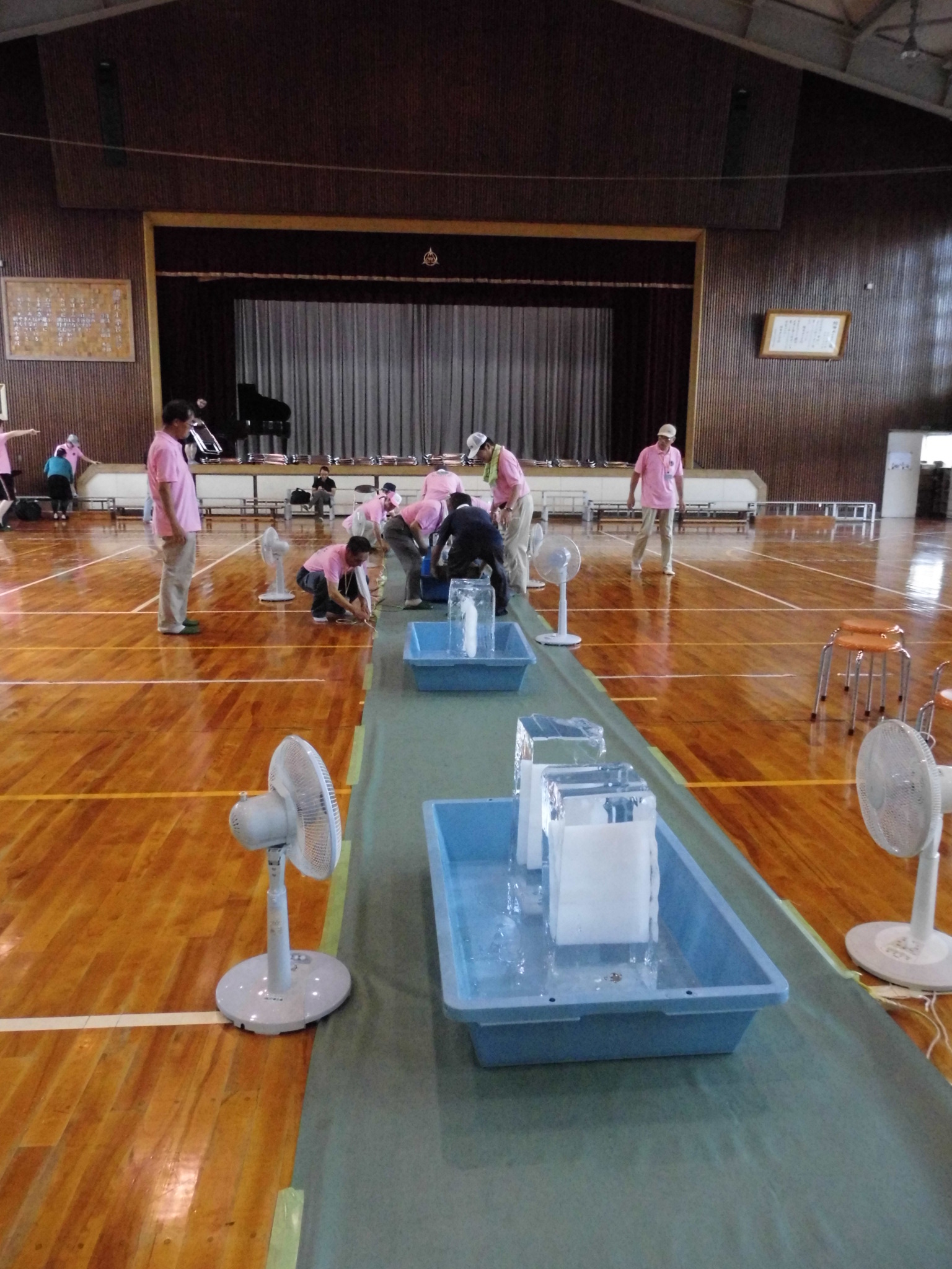 体育館には冷房の設備が無い為、沢山の扇風機と氷柱を準備頂き少し暑さがしのげました。