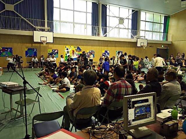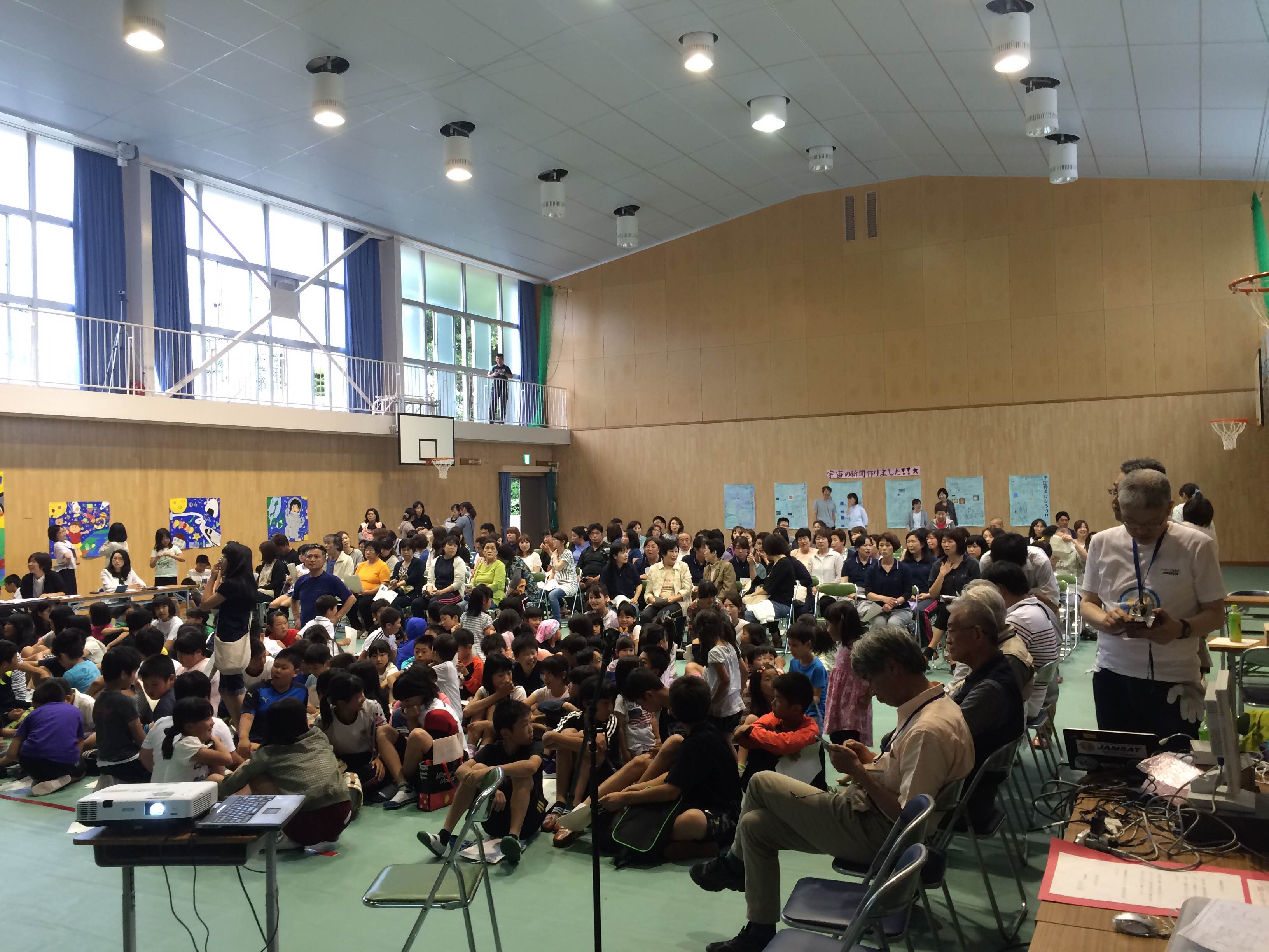 島じゅうから町の人、子どもたち、体育館に約5~600人あつまりました。子どもたちとカウントダウンをおこない、オペレーターが宇宙飛行士を呼び出し開始します。17時28分からコールしてほぼ2回目ぐらいで宇宙ステーションとつながり、ノイズ交じりで信号が弱かったのですが交信は、成功しました。