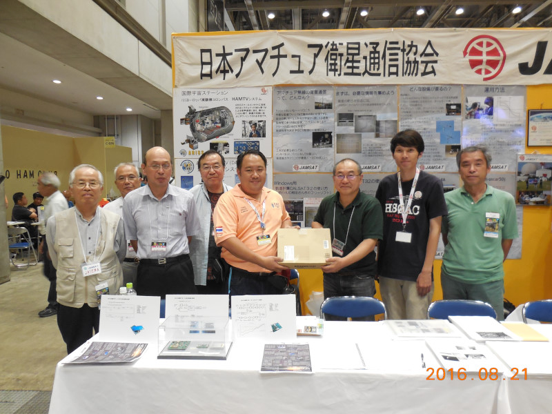 21日には、一昨年ハムフェアで展示しましたJAMSATリニアトランスポンダーのテスト版をタイのバンコク大学の衛星チームに寄贈いたしました。同チームもトランスポンダーを計画していて、そのテスト用に使っていただければと言う思いで寄贈しました。