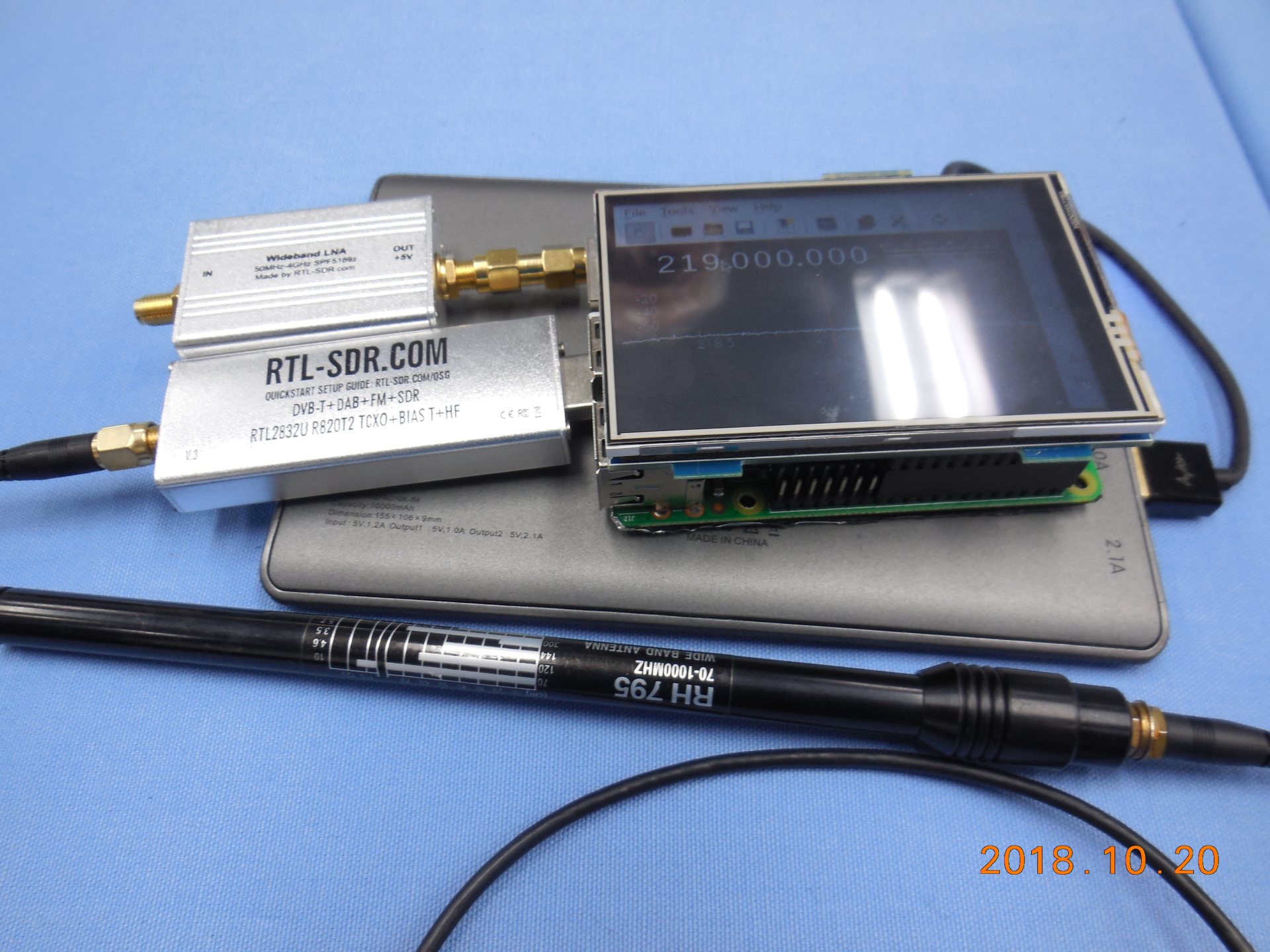 Raspberry PiとSDRを組み合わせ、下はバッテリ(JI1SZP製作)