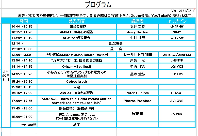 ※会員の方はニュースレター同封の葉書(3月13日(土)必着)でご連絡ください。 ※会員以外の方で参加を希望される方は、「ja0fkmアットマークgmail.com」までメールで事前登録してください。(3月13日厳守) ⇒件名:JAMSATシンポジウム参加希望 として、お名前、コールサイン等をお知らせください。(URLをお送りします)