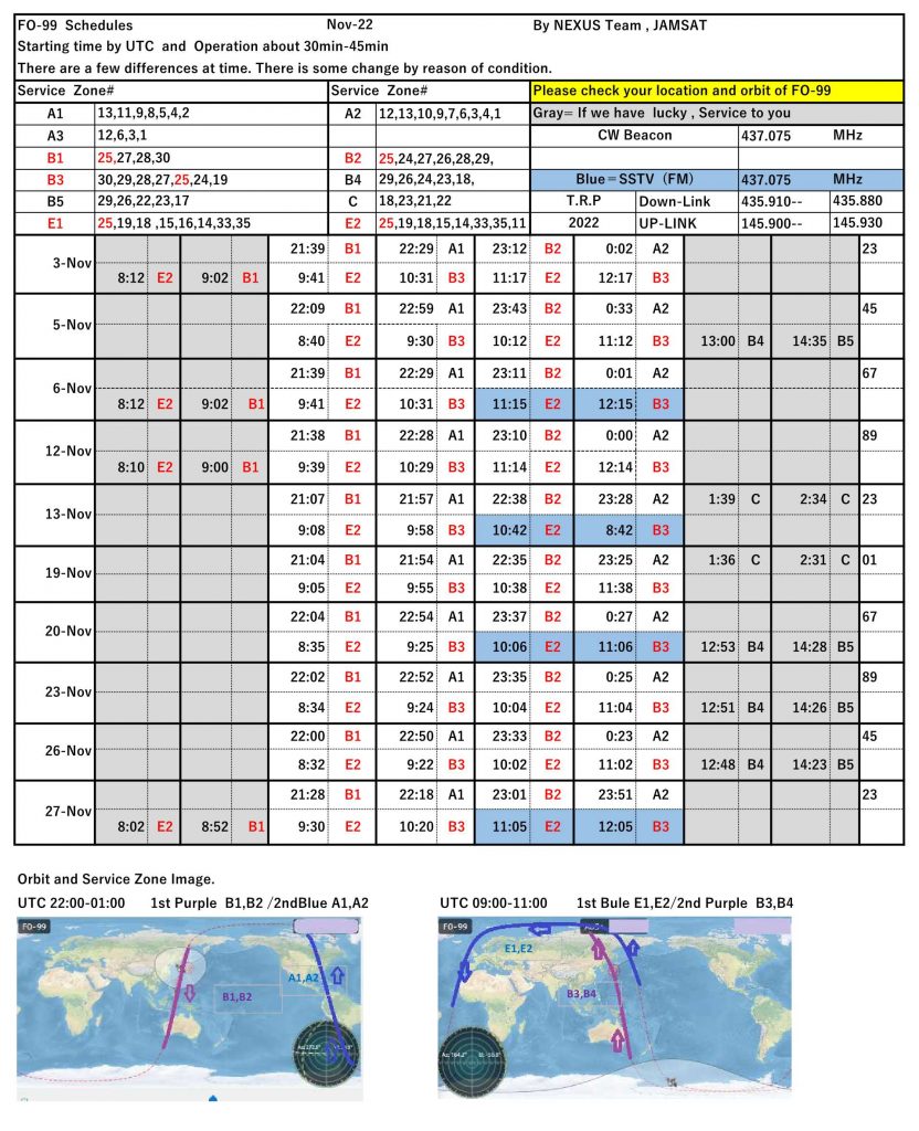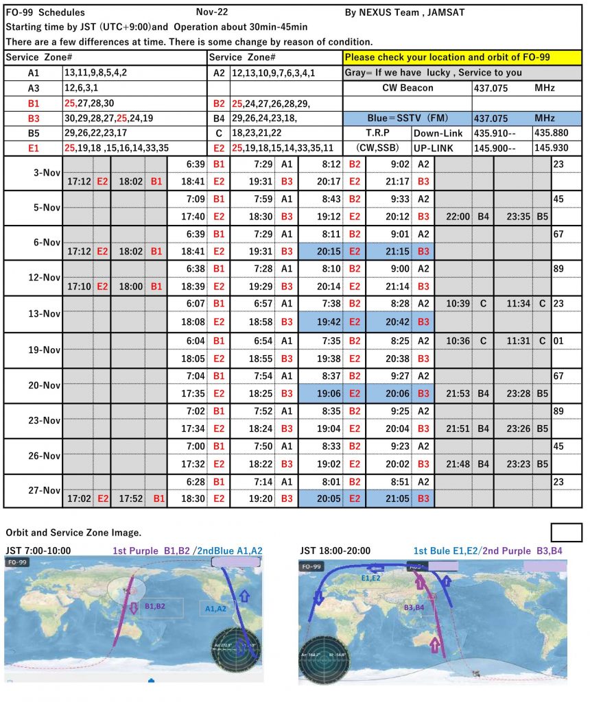 NEXUS (FO-99) operation schedule November/2022 投稿日時: 2022年11月2日 投稿者: 大谷芳充 This is the NEXUS (FO-99) operation schedule for November 2022. The operation of DigiTalker will be closed. Please enjoy NEXUS / FO-99 ! NEXUS operations team. JH4DHX/3 Y.Ohtani ツイート
