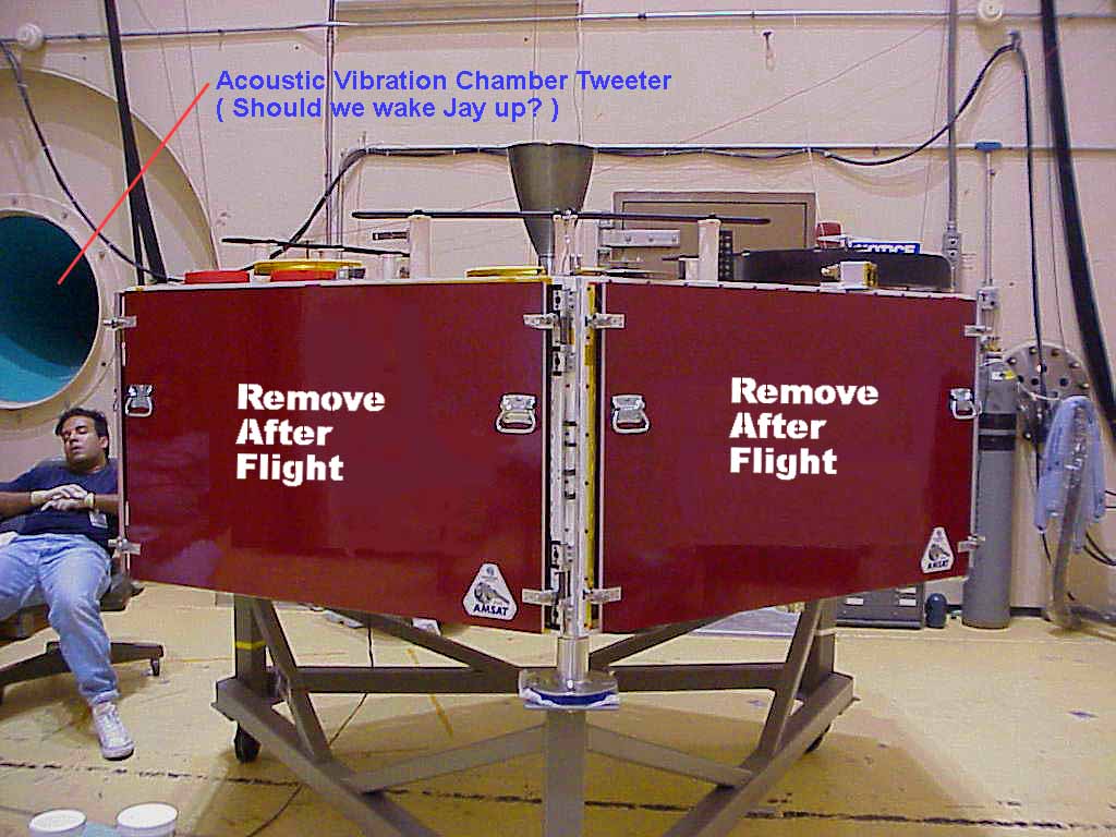 Space is short at GFSC so they let us use their acoustic test cell to prepare P3D. The woofer (not shown) is large enough to swallow P3D. It is located above the tweeter. In this photo P3D is as close to flight ready as she has ever been. Only the Solar Array Pyros are not installed (safety reasons) and the fuel tanks are filled with a mass substitute rather that actual fuel.