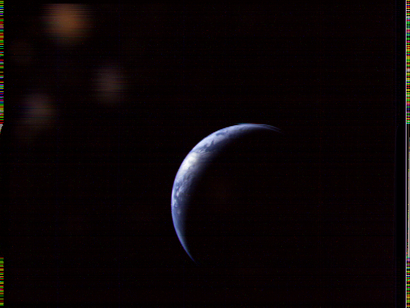 SCOPEが採用しているCCDチップはインターレース・スキャン方式であり、奇数ラインをスキャンした後に偶数ラインをスキャンします。このため、露出時間(初画像は30ミリ秒)とこのスキャンの間に、約2.2RPMで回転している衛星から見た地球はずれてしまい、これが滲みとして撮影されます。