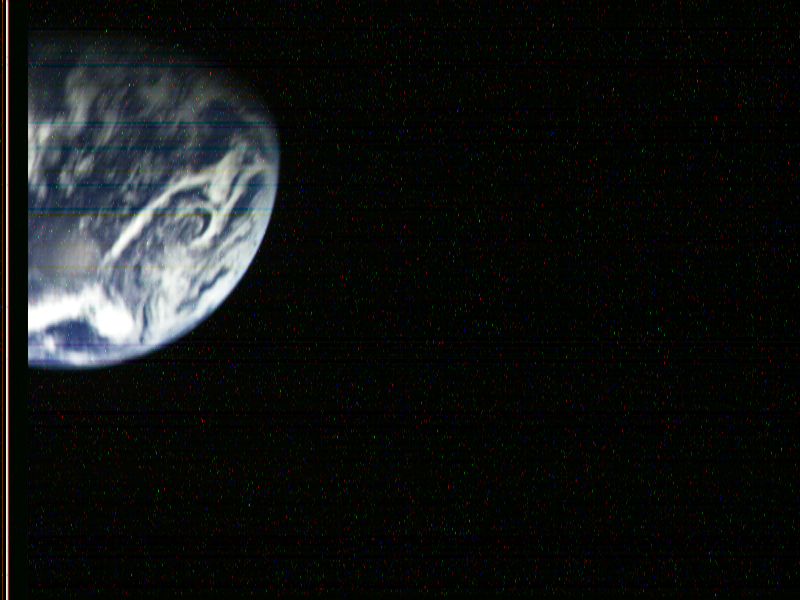 SCOPE デジタルカラーカメラ実験では、1つのモジュールケースに2台のカメラ、カメラ-Aとカメラ-Bが組み込まれています。このモジュールはAO-40衛星のベイ2に搭載されています。 これら2台のカメラは光学系の焦点距離が異なる他は全く同一の構成となっています。現在、衛星はスピン安定により姿勢制御されているため、衛星の回転とともにSCOPEカメラも回転しています。 この回転のために撮影された画像はブレてしまいます。また一枚の画像は偶数と奇数フィードに分けてサンプリングされるため、1/10秒の露光においても特に画像の周辺部でフィールド間のブレが顕著に表れています。ここでは偶数フィールドを削除し、奇数フィールドのデータで補完した画像と、元データをご覧いただけます。