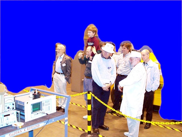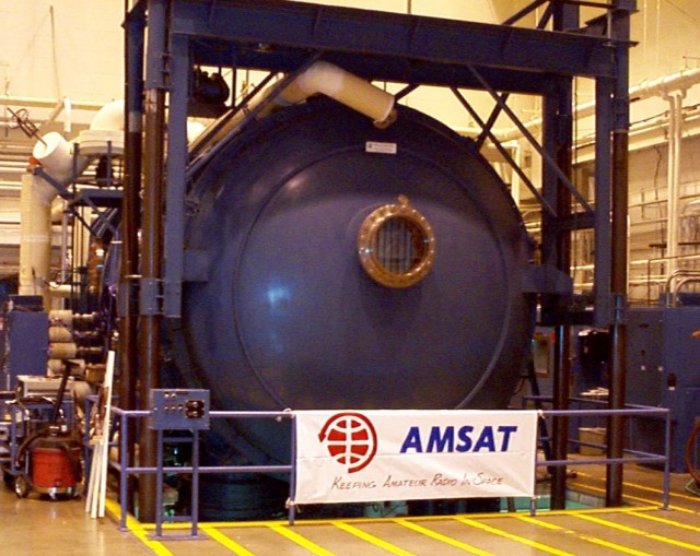 - クリーンルームエリア. P3D は、チャンバーに入れられる前にまずクリーンルーム置かれました。試験機材はこのエリアにセットアップされました。RickとBobがアンテナのケーブルにロープを結んでいます。このアンテナが道路を挟んだところにいるRUDAKチームとの無線リンクを提供しました。