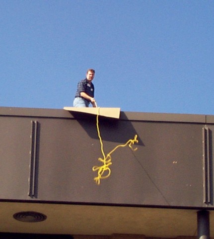 - 実は規則があって、屋上の縁に立てるのは特定の人だけでした。 Bob は後ろに立って Orbital社の社員がロープを引っ張るのを見ています。Chuck Green が下にいます。