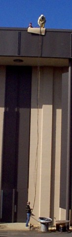 - Orbital社のビルディングの屋上に144, 430, 1296, 2401 MHzのアンテナを設置しました。Bob が屋根からロープを投げ 降ろして、アンテナを引き上げる準備をしています。