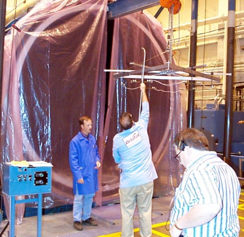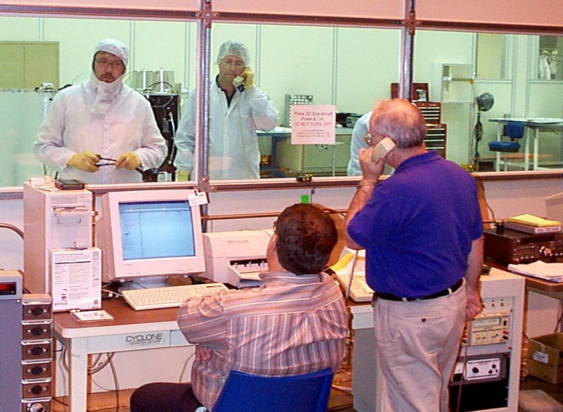 - Orbital社の提供してくれた作業環境はすばらしいものでした。 いろいろな種類の高出力照明器具の光が交じり合っているのですが写真の色が妙な具合になってしまいます。これはクリーンルームエリアです。BobとMichaelが中に、RickとLouが外にいます。
