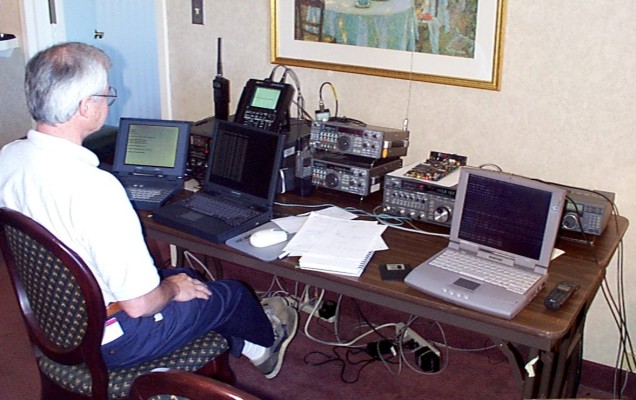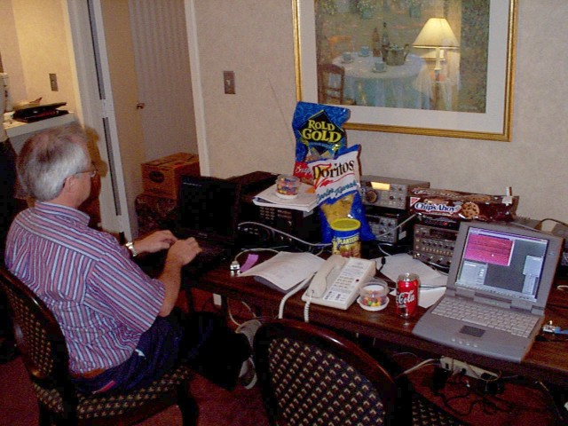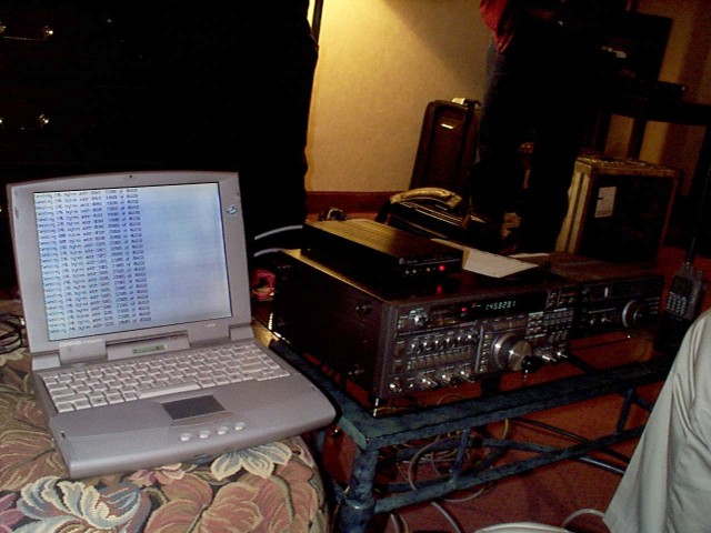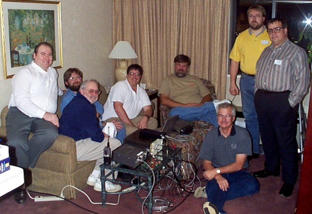 - RUDAKのスイートになんにんかのRUDAKと衛星チームのメンバーが集まりました。左から右に Peter, Harry, Lou, Harold, Bdale, Jim, Michael, Rickです。仮設局がテーブルの上にあります。後にソファを動かしてテーブルに3つの局セットしました。