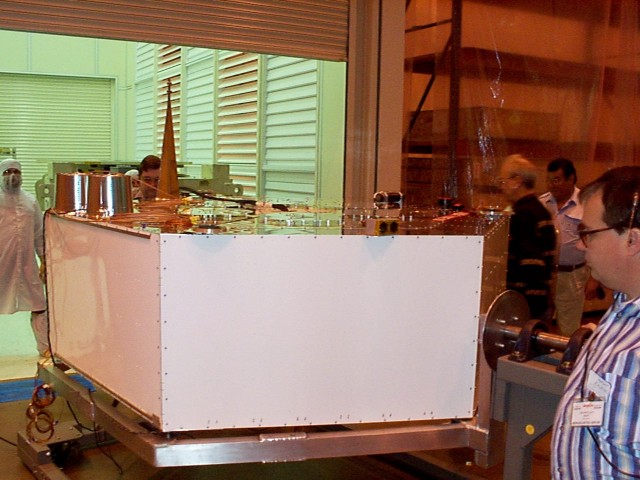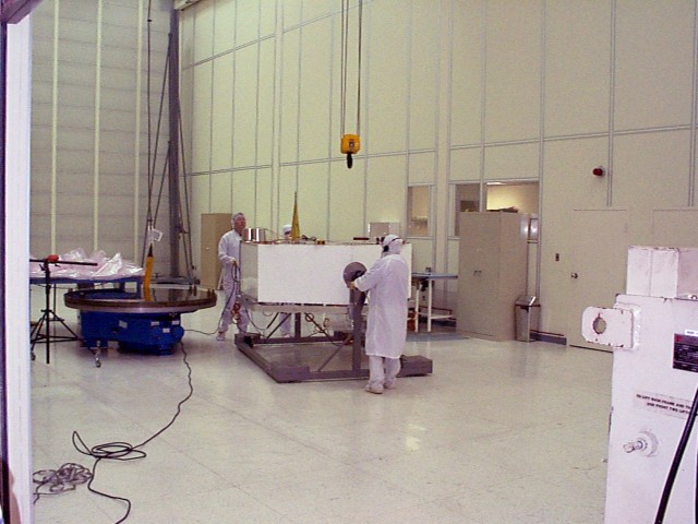 - ほかのアマチュア衛星に比べるとP3Dは非常に大きな衛星で、事実オーランドのクリーンルームでは大きく見えます。でもOrbitalのクリーンルームでは小さく見えます。P3Dはクリーンルームを出てチャンバーに向かうところです。