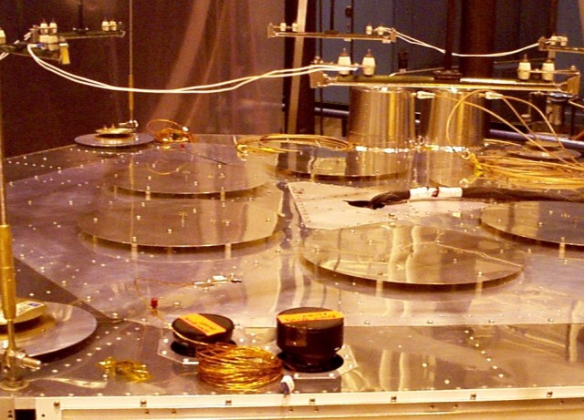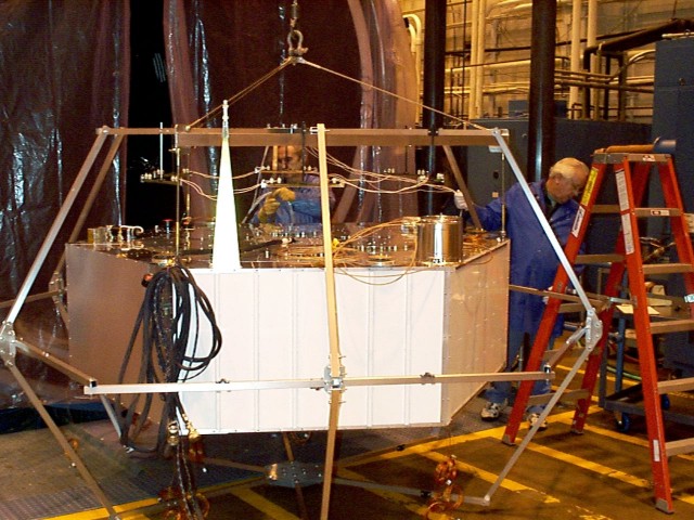 - 赤外線ランプを取り付けるための ゆりかご に入ったP3D。P3Dの上にいくつかの赤外線ランプが見える。 この視線がちょうど熱真空試験の最中にチャンバー内でSCOPEが撮影したのと同じ向きです。チャンバーの中では、反射加工されたマイラーをアルミの板にテープで止めた即席の鏡をここに手前に見えているSCOPEのレンズ(キャップがはまっている)に立てかけて撮影しました。
