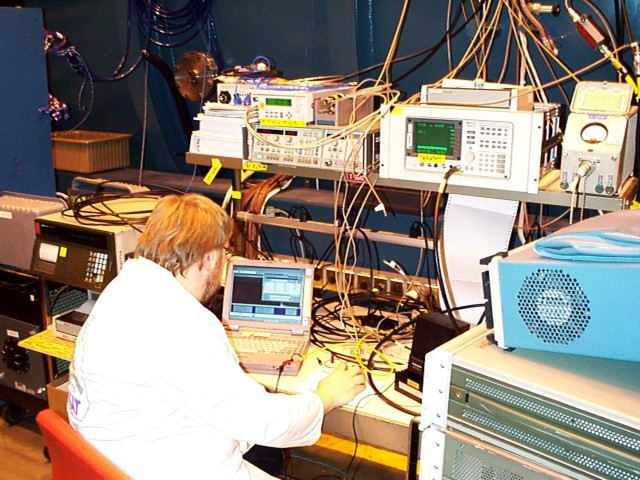 - Michael Fletcher OH2AUE はチャンバーの隣のこのRF計測室に泊まり込んでいました。モードやテレコマンドやアンテナやダミーロードの切り替えに混乱してアップリンクやダウンリンクが途絶えた時には Michael が原因を探してくれました。