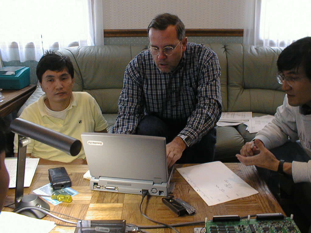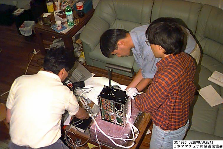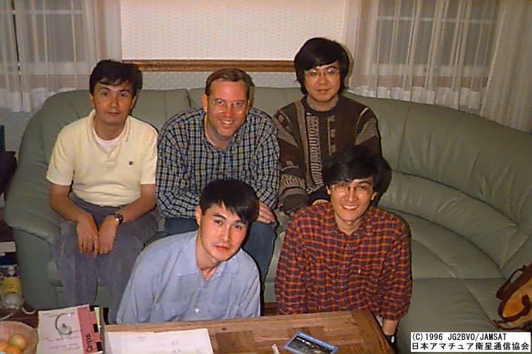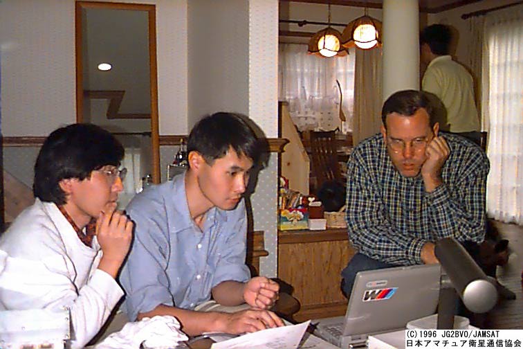 RUDAK-U/SCOPE合同ミーティング 日本で開催(1996年11月9〜10日) 1996年11月9〜10日(土〜日曜日)、RUDAK-UとSCOPEチームの合同ミーティングが千葉県市川市で開催された。今回のミーティングは、RUDAK-Uチームの WA7GXDライル・ジョンソン氏が本業の出張のため来日した機会を利用して行われたもので、ライルにとっても、そしてSCOPEチームのメンバーにとっても、休日を返上してのミーティングとなった。 彼の来日を前にして、JAMSATのSCOPEチームから、組立を完了したSCOPEモジュールのエンジニアリングモデル1台と、パソコンでSCOPEモジュールを操作するためのソフトウェア、さらに CAN-BUSインターフェース回路の1式を、アメリカの RUDAK-Uチームに発送してあった。これは、SCOPEモジュールとRUDAK-Uモジュールの接続試験を行うためのもので、これらを使用して、他の機器とSCOPEモジュールとの間で CAN-BUSインターフェースを経由しての接続確認、さらにバックアップとして RS-485シリアルリンクでの接続確認などが行われる。