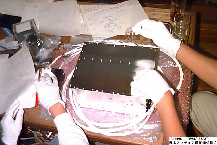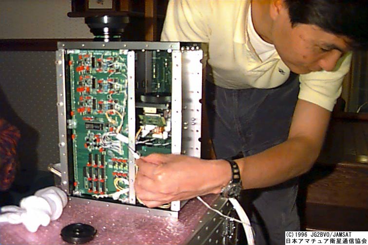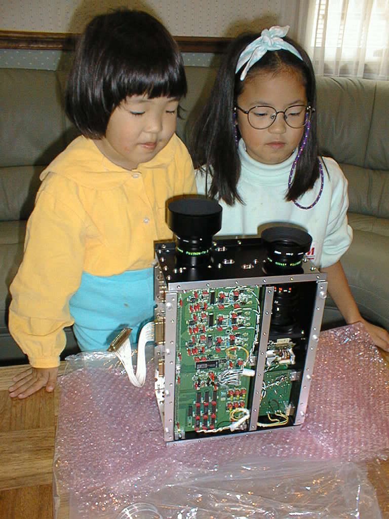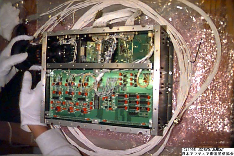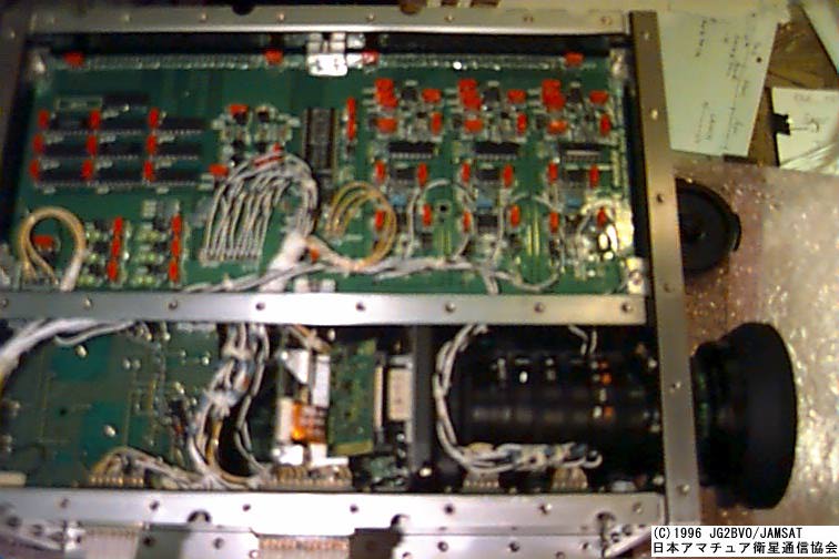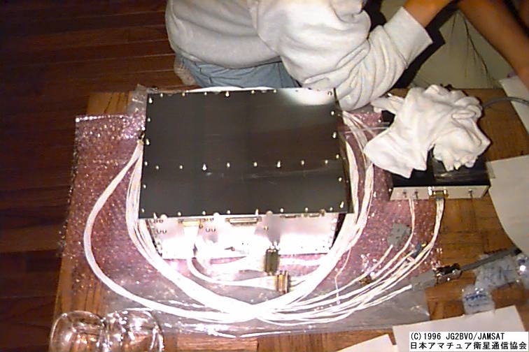 JAMSATが製作した、実際に宇宙へ飛ぶ SCOPEのフライトモデル。突き出した2本の光 学系(レンズとフード)も、ダミーではなく宇宙仕様のもの。フライトモデルの本当 の完成までには、ブートROMコードの最終焼込みだけが残っており、これはRUDAK-Uモ ジュールとSCOPEモジュールを接続して行う試験が完了してからになる。 SCOPEモジ ュールは、1996年8月に、モジュール全体を真空チャンバーに入れて動作試験を行う 真空試験を済ませている。さらに温度試験も今週予定されている。光学系に関しては 、さらに真空試験を行うことも計画中。また、改造やデバッグ、そして動作試験のた めにこのSCOPEモジュールは、東京近郊だけでなく、京都や大阪にもたびたび運搬さ れており、その道中の振動や衝撃に耐えて、十分に動作している。写真は、SCOOEチ ームの JR1ING菊川氏撮影。