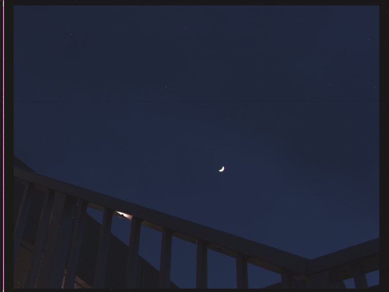 三日月、露出 10 秒、x32 ND フィルター付き、カメラ-A (狭角). 小さすぎるし暗すぎますか? でも、月までの距離と月の大きさを考えてみてください。地球は月よりもずっと大きく、P3Dは遠地点でも月よりずっと近くにあるのです。よく見るとあちこちに点が見つかるでしょう。これらは星ではなく、ホットピクセルと呼ばれるノイズのようなものです。この画像からダークフレームと呼ばれる画像を引き算処理することでこのノイズを見かけ上消すことができます。(1997 5月撮影)
